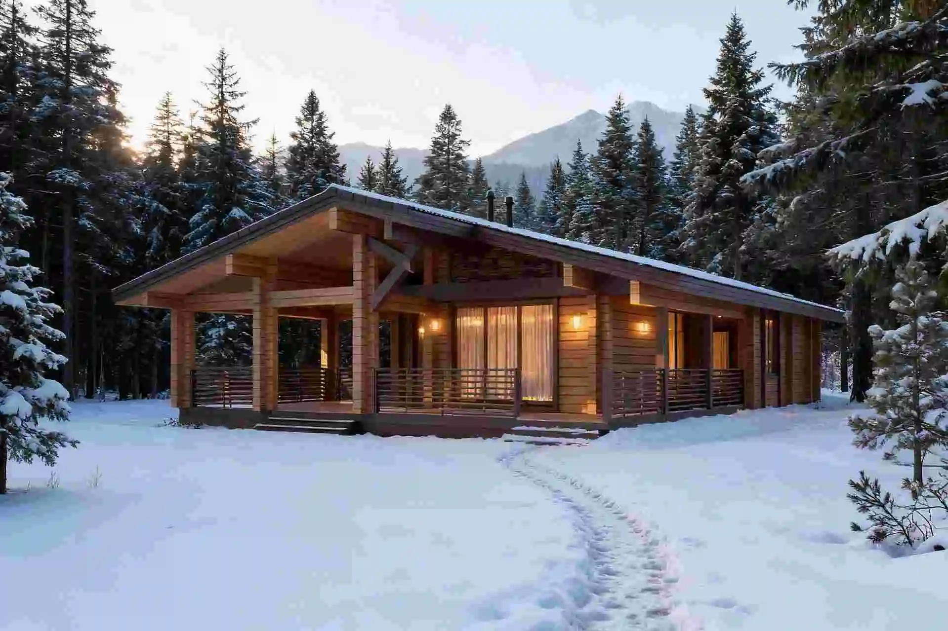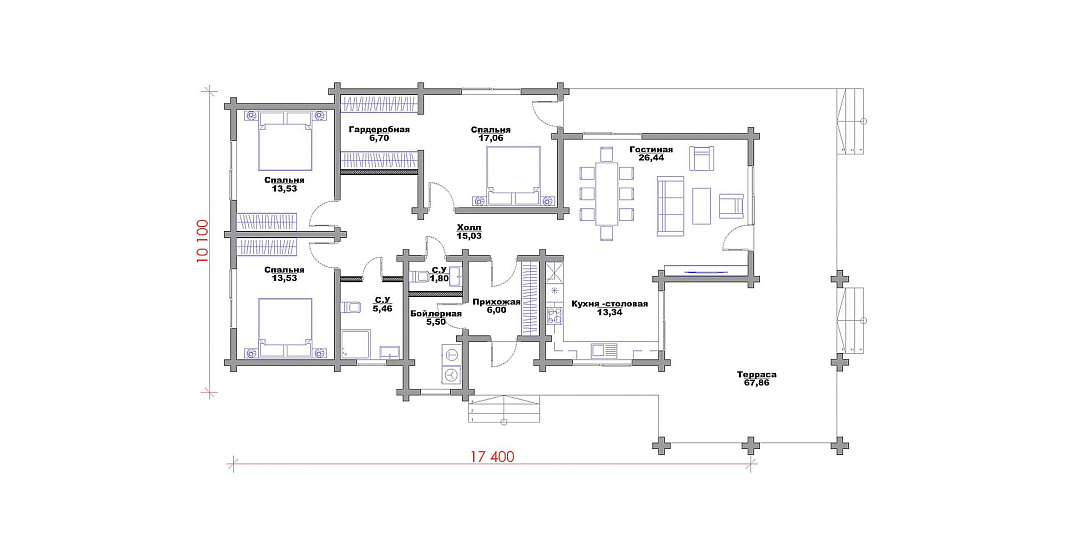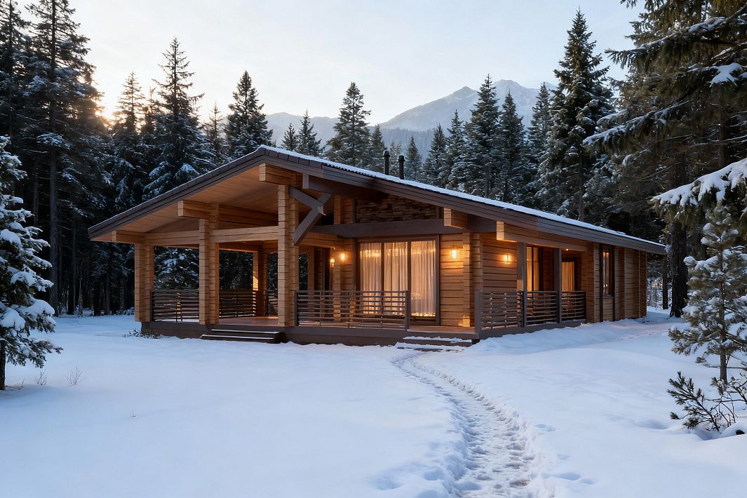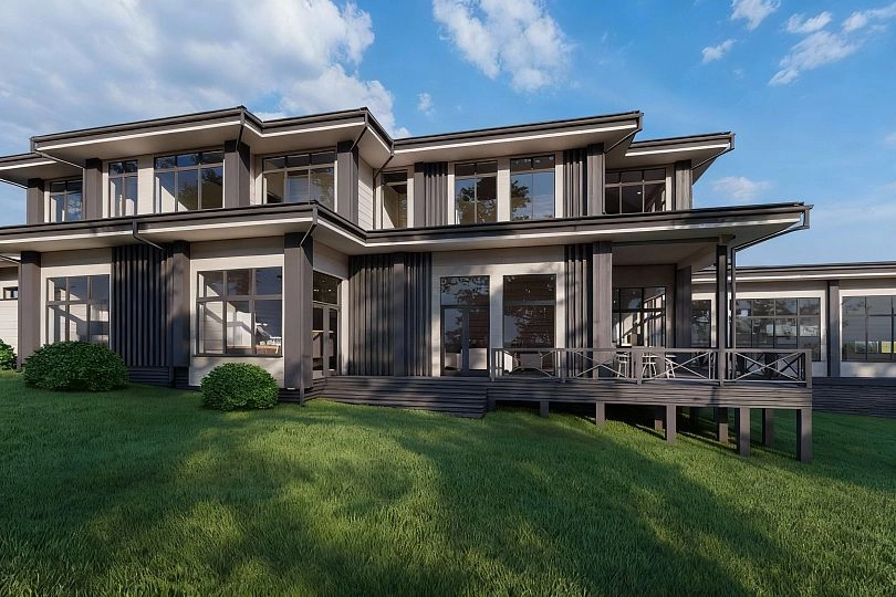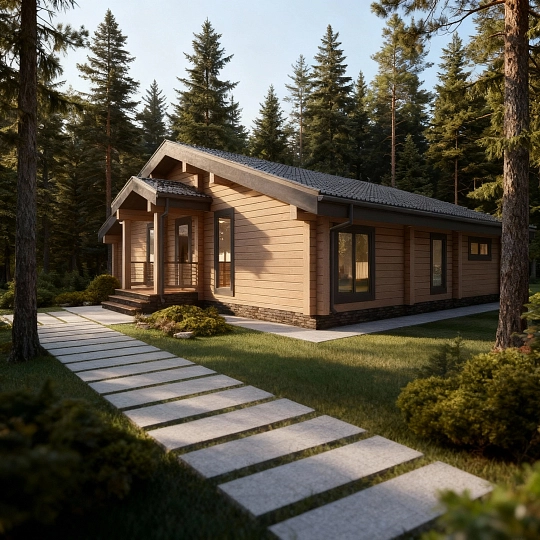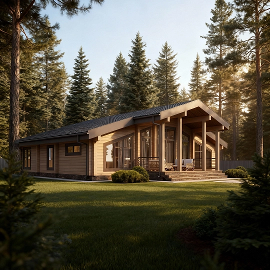 Стильный одноэтажный дом с просторной террасой. Для проживания семьи из 3-4 человек.