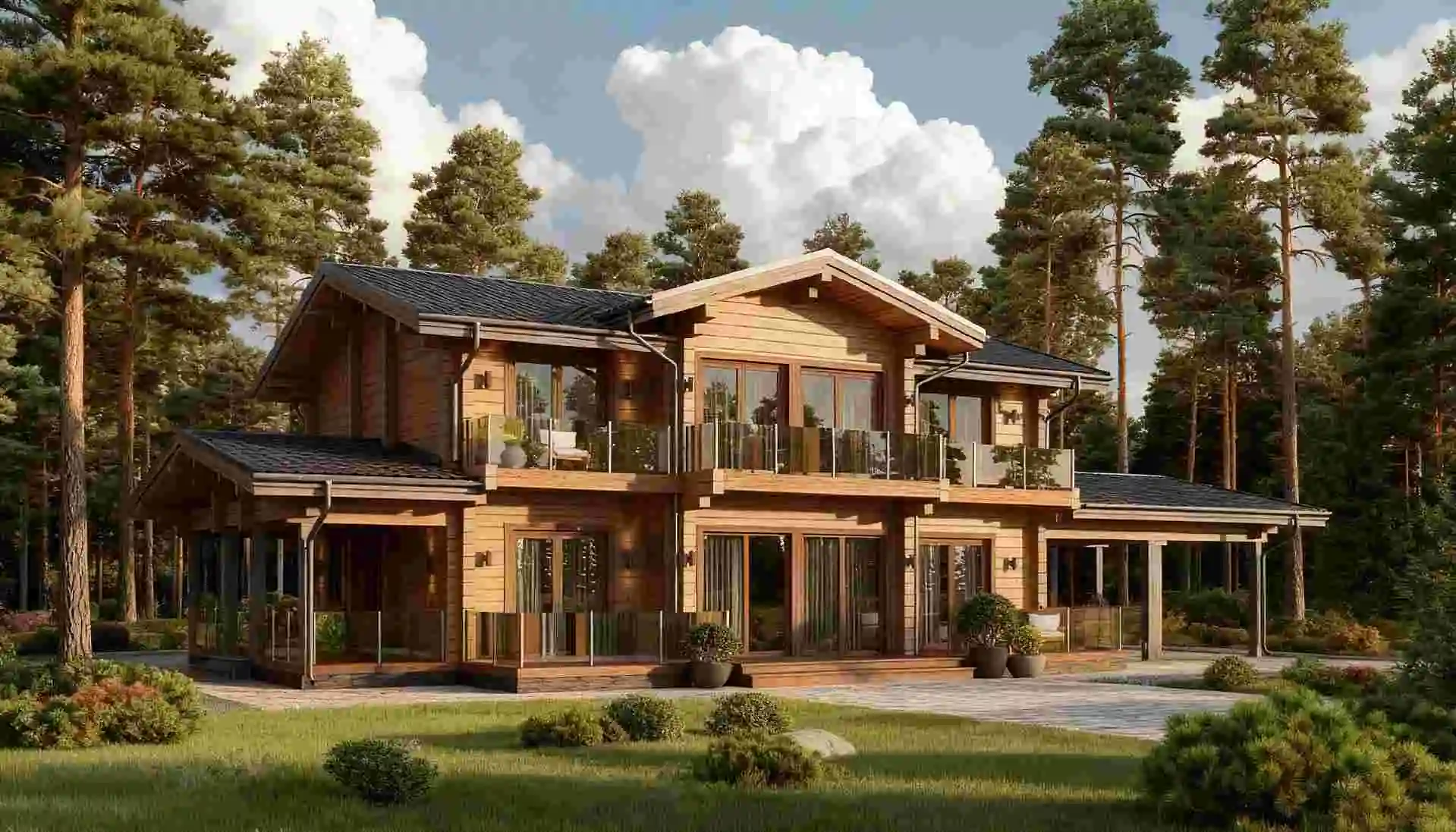 Конструктив: из клееного бруса 200х185 (экспортный клей, европейская сертификация). Лаги этажей, все необходимые материалы (включая узлы силы, rothoblaas – включены). Сверловка под скрытую электрику, чаши, вертикальный транспорт: включено