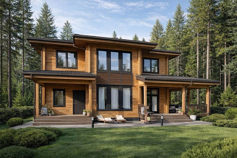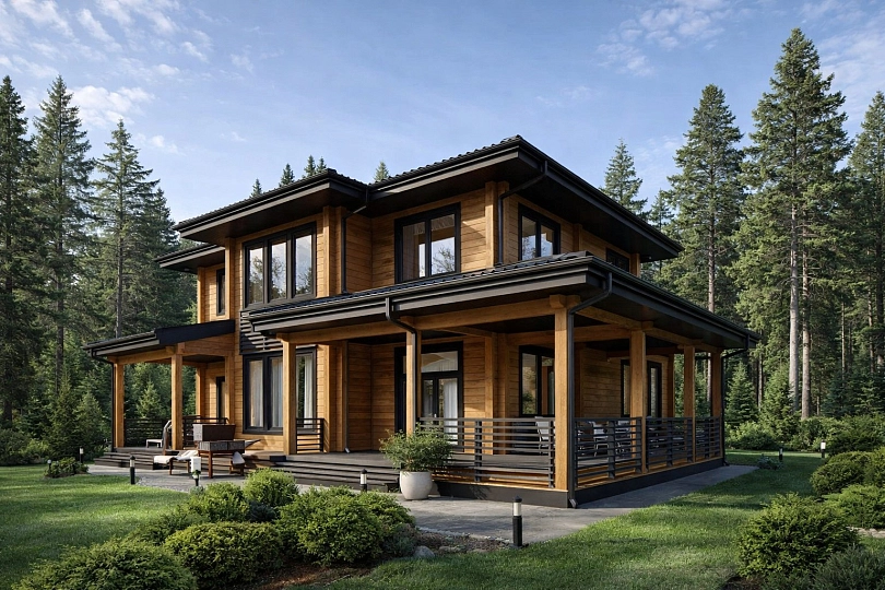 Фасад дома окрашен в теплые коричневые тона. Текстура и запах дерева погружают в эстетику загородной жизни. Планировка дома отлично подойдет тем, кто ценит стиль и практичность.