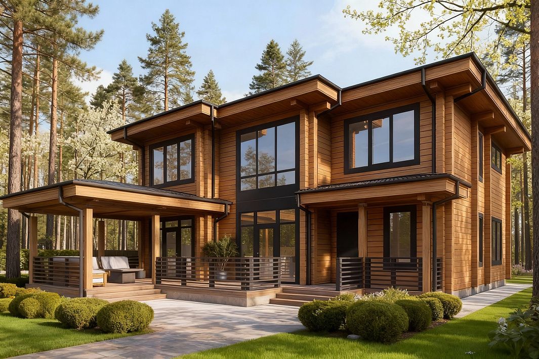 Внешняя чистовая отделка: покраска и герметизация дома, монтаж и подшив свесов кровли, укладку полов и террас, установку наличников и иные работы для доведения дома под ключ.