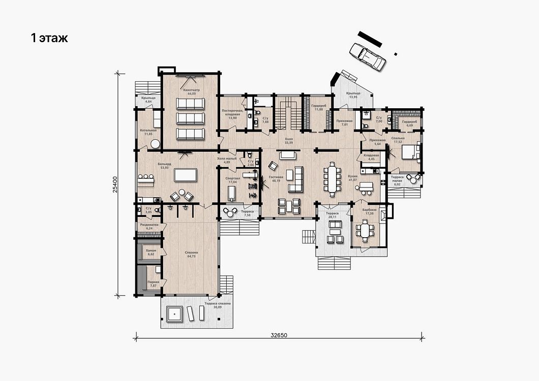 Первый этаж дома предоставляет множество возможностей для развлечений. В распоряжении находится большой кинотеатр, где можно наслаждаться просмотром фильмов в уютной и комфортабельной обстановке. Зона бильярда и спортивный зал с выходом на террасу. Блок спа зоны с парной и хамамом продолжающийся на отдельной террасе — уникальная возможность расслабиться и насладиться спокойствием и гармонией.
