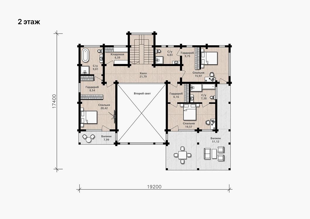 Второй этаж дома комфорт для уединения. Здесь расположены три мастер-спальни, каждая из которых имеет выход на балкон, что создает уникальную атмосферу пространства, где можно наслаждаться красотой и покоем природы. Балкон площадью 50 квадратных метров идеальное место для расслабления и уединения на свежем воздухе.