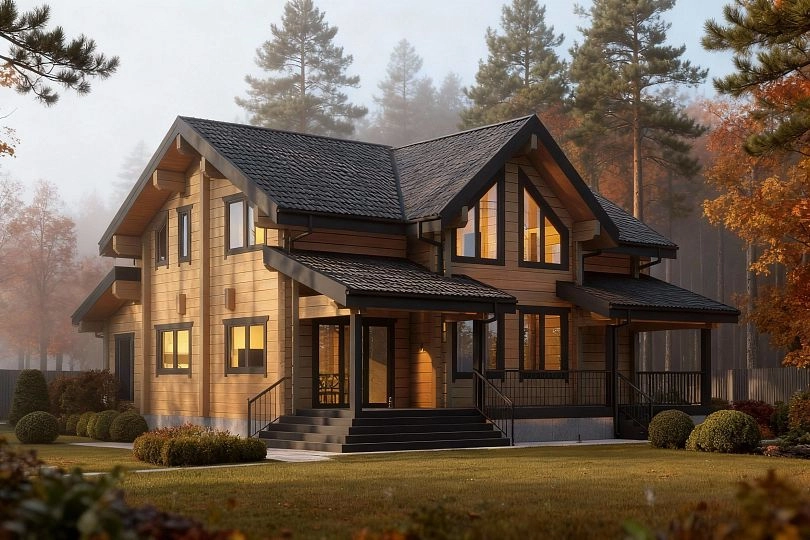 Конструктив: из клееного бруса 200х185 (экспортный клей, европейская сертификация). Лаги этажей, все необходимые материалы (включая узлы силы, rothoblaas – включены). Сверловка под скрытую электрику, чаши, вертикальный транспорт: включено