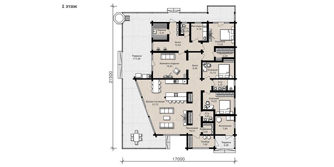 Внутри дома открытое пространство кухни-гостиной площадью более 50 м² служит идеальным местом для совместных встреч и отдыха, создавая атмосферу уюта и свободного общения.