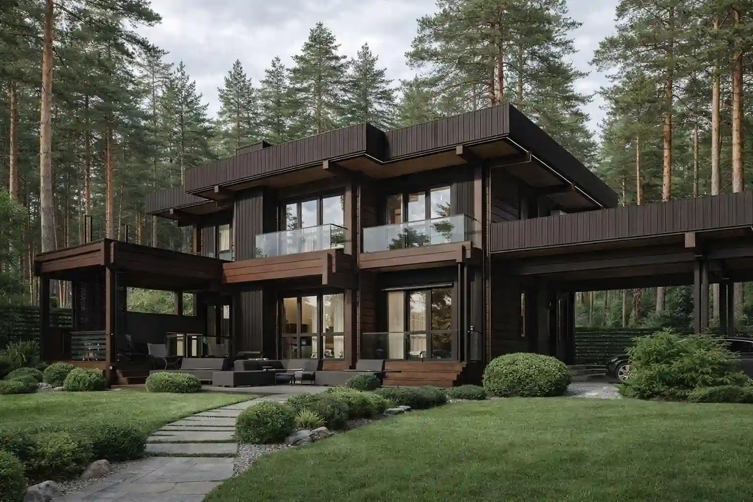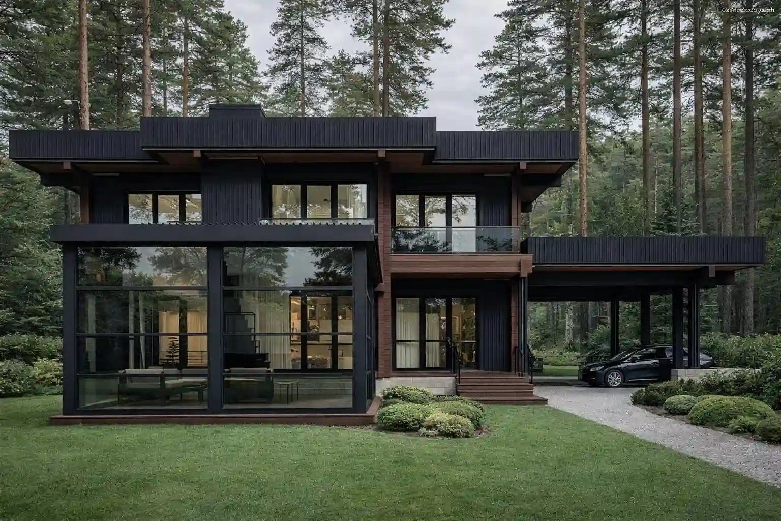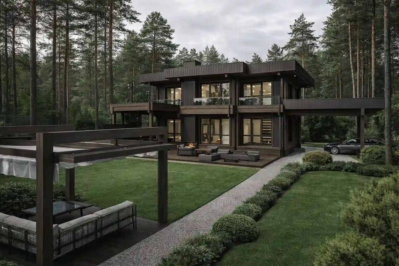 - Второй свет. Первый этаж имеет двухсветное пространство над гостиной. Второй этаж формирует галерею/балкон, нависающий над зоной отдыха — создаёт ощущение простора без увеличения площади.