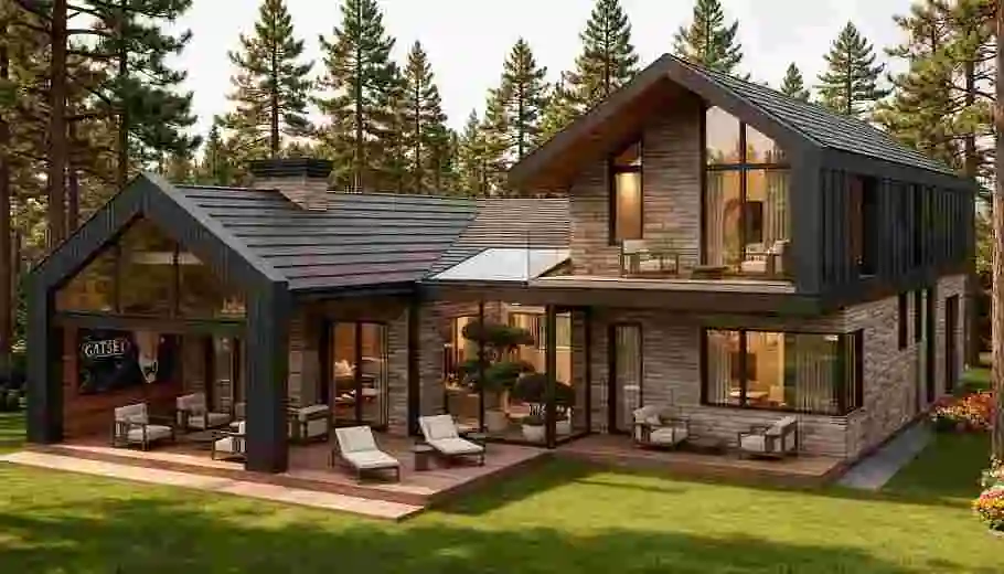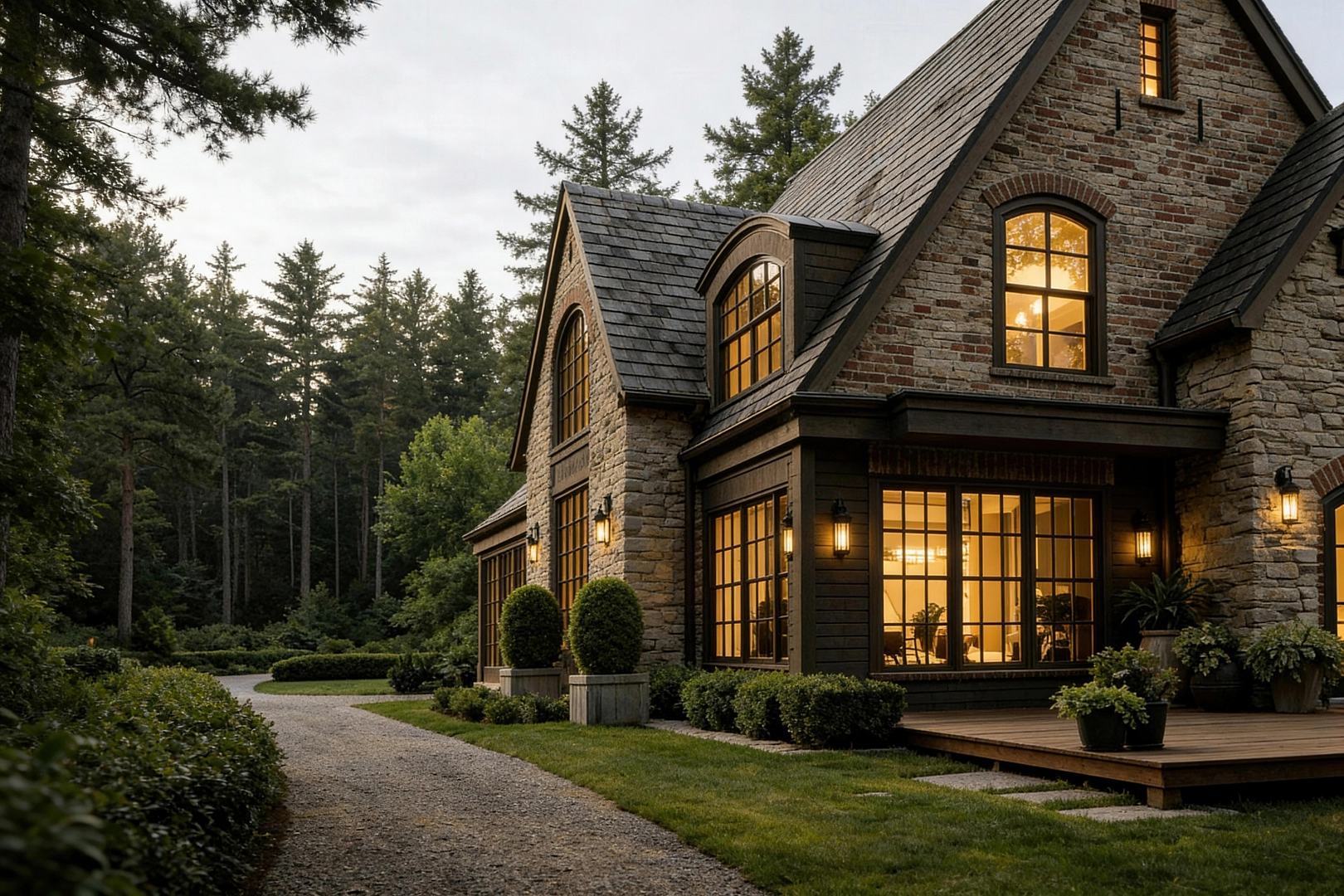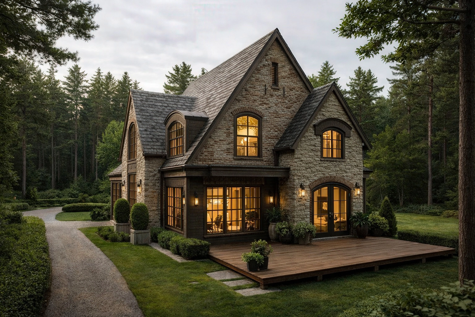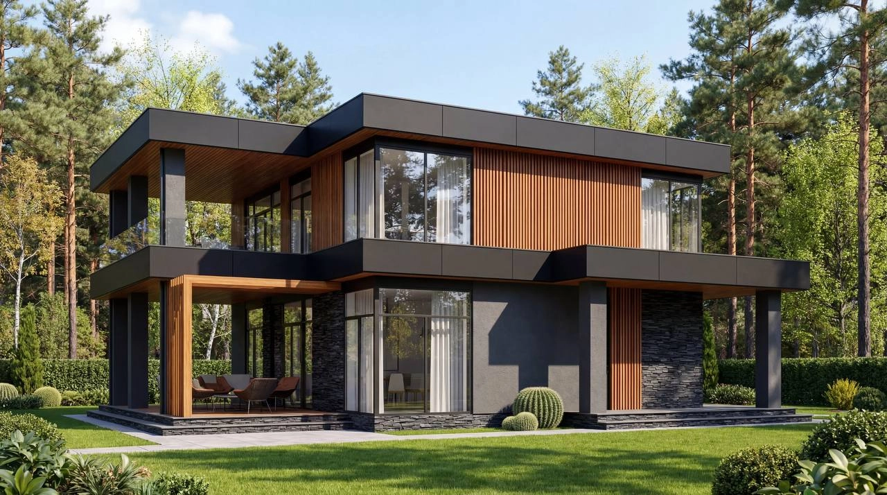 Этот стиль основывается на идее гармонии с природой: дом словно становится частью участка и подчеркивает красоту окружающего ландшафта. Для него характерны широкие горизонтальные линии, большие окна, плоские или пологие крыши, а в отделке преобладают спокойные, натуральные оттенки. Атмосфера таких домов ассоциируется со статусом, балансом и ощущением единства с окружающим миром.