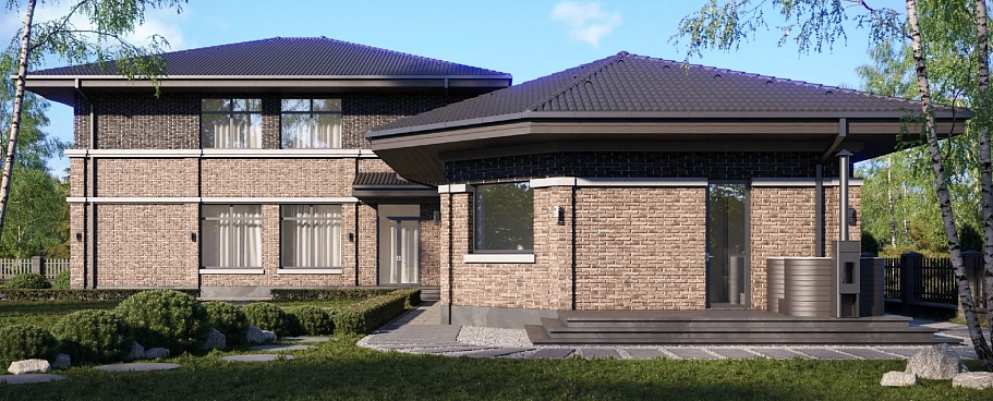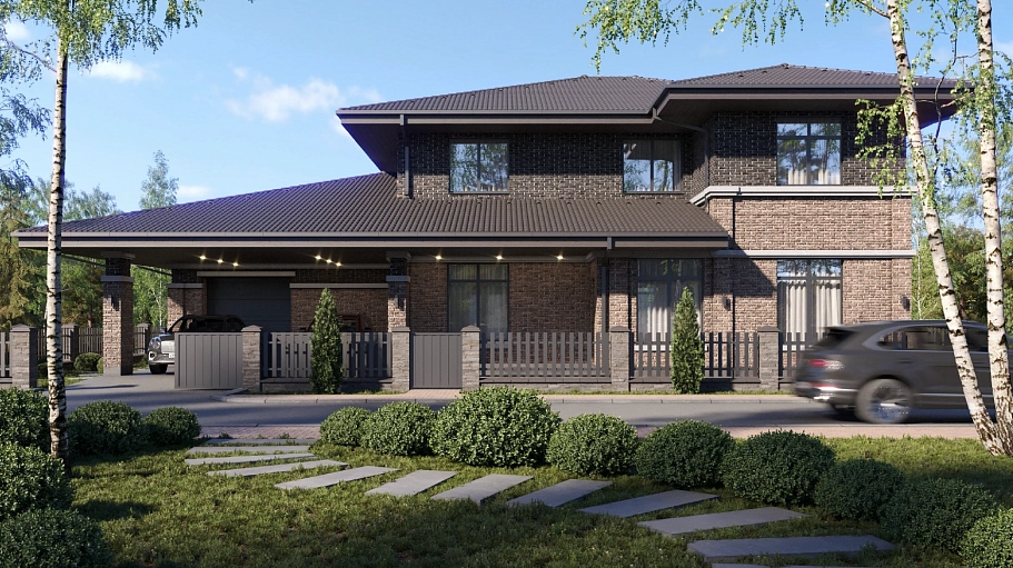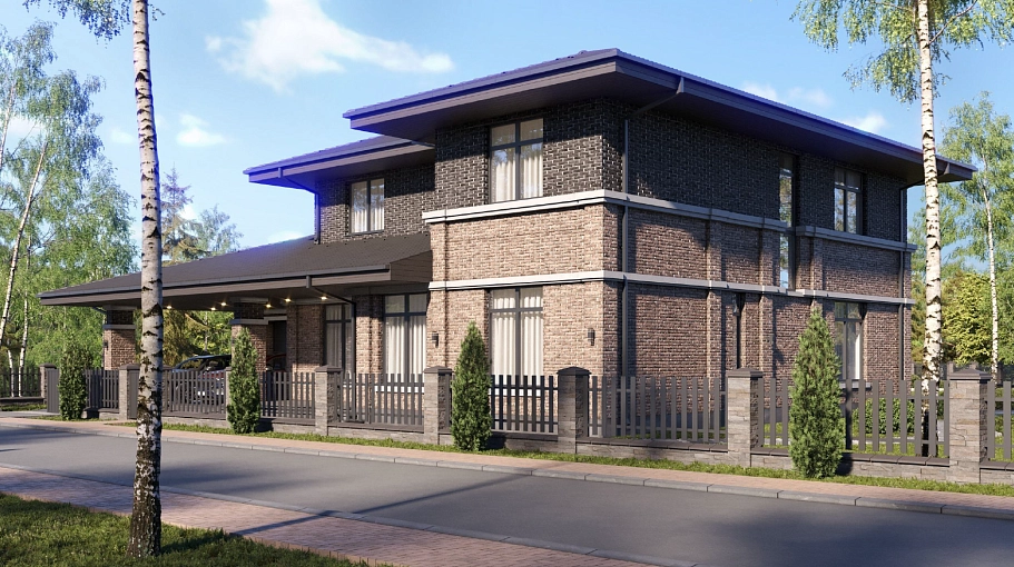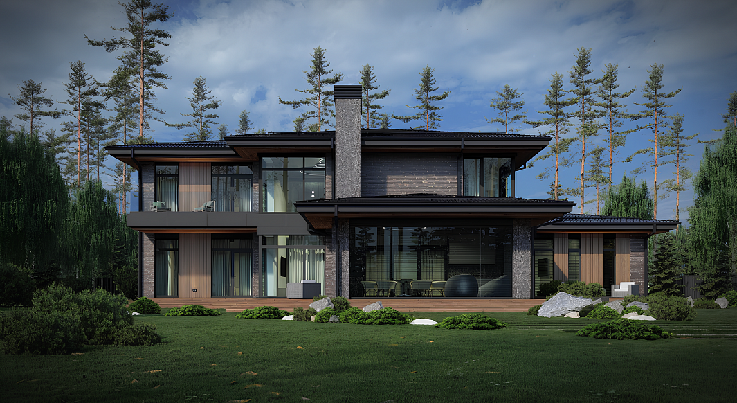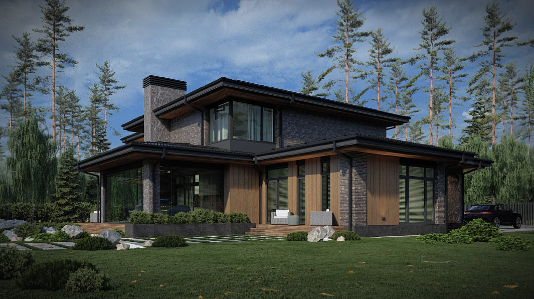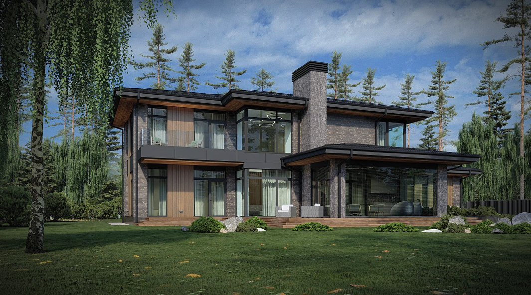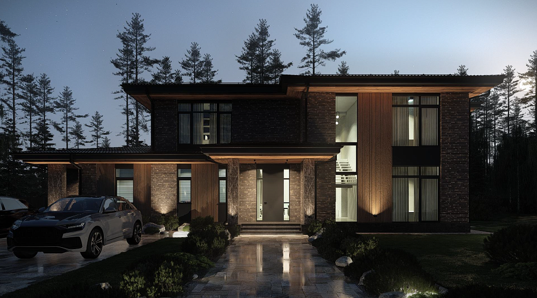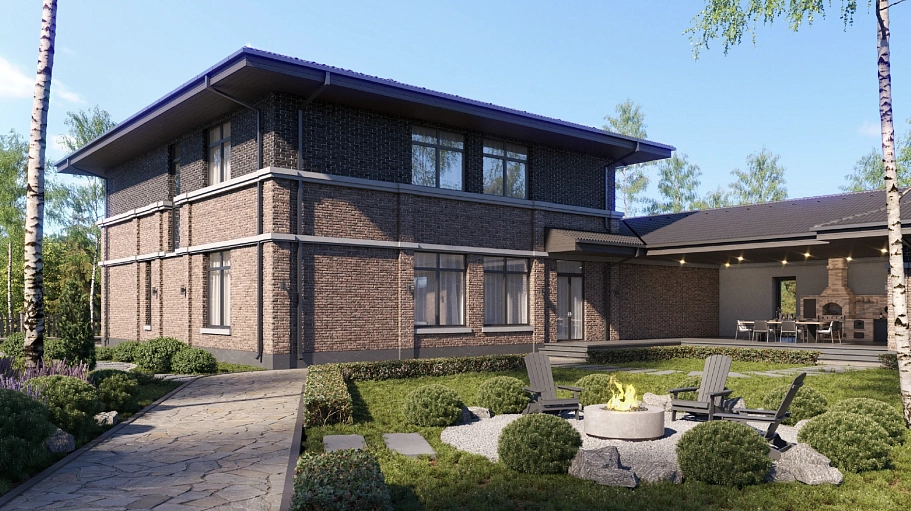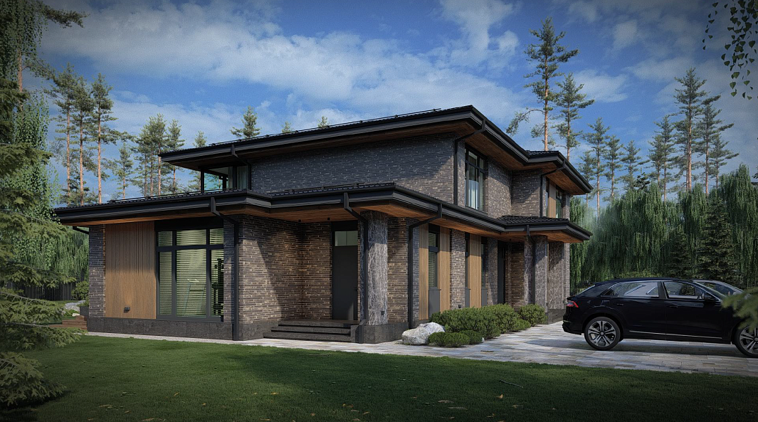 Bravarn - проект двухэтажного дома, который идеально сочетает сдержанную элегантность, выразительность и комфорт загородной жизни. В его облике органично переплетаются теплая древесина, строгий кирпич и панорамное остекление. Плоская крыша с выразительными выносами подчеркивает геометрию здания, придавая ему динамичность, а массивный каменный дымоход становится центральным акцентом фасада. Балкон второго этажа завершает композицию, открывая живописные виды, а уютное патио служит естественным продолжением жилой зоны.