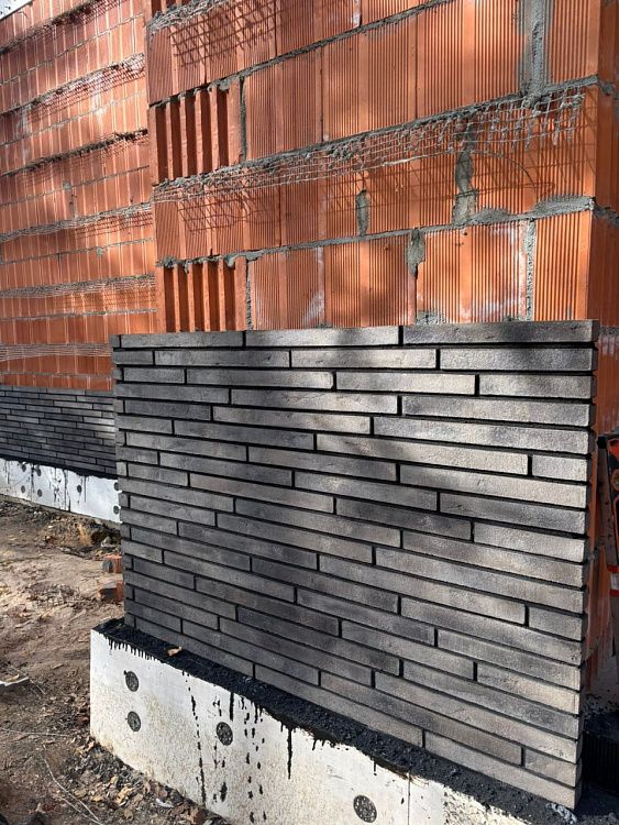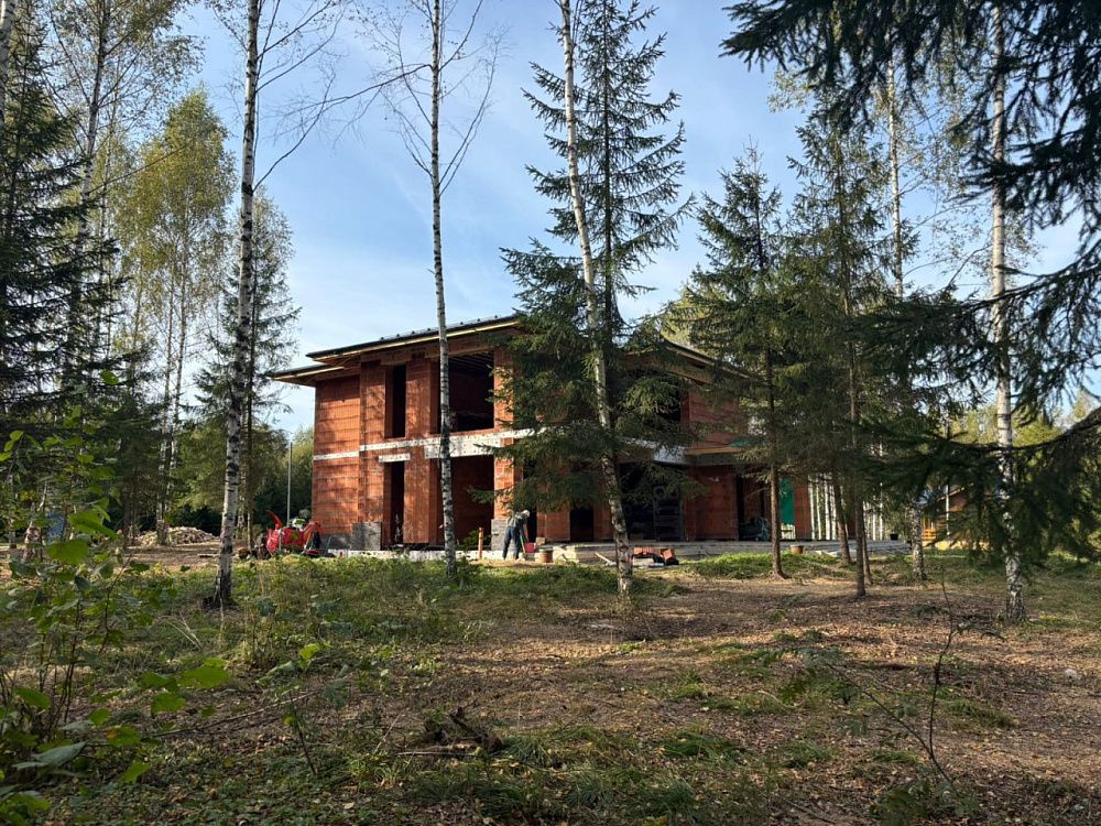 Стеновой комплект из блоков Porotherm и кровля выполнены! Наша бригада приступает к облицовке фасада — шикарный по нашим меркам кирпич ручной работы RIEGEL 500. Вслед за ним стены дома украсит натуральный планкен