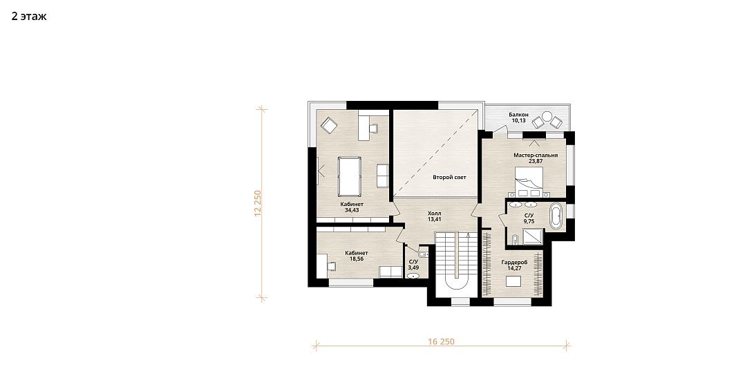 На втором этаже вас встречает широкий холл, разделяющий пространство на две зоны. Справа расположена мастер-спальня с выходом на балкон, где можно наслаждаться свежим воздухом и видами. Слева — два кабинета, каждый из которых предлагает комфортные условия для работы, будь то для бизнеса или личных дел.