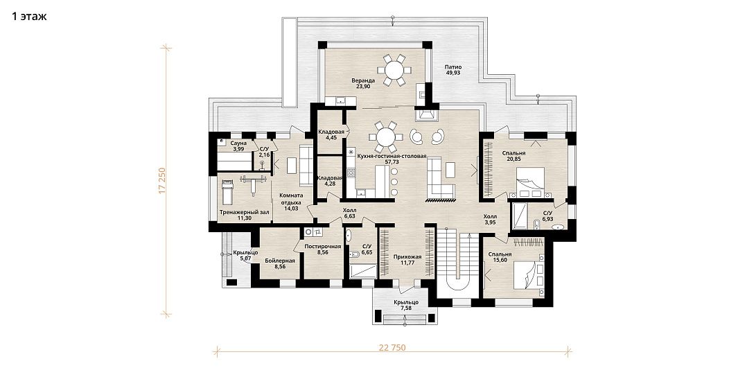 Доминантой дома является кухня-гостиная-столовая с кладовой. Камин, расположенный в центре, становится важным акцентом интерьера, создавая атмосферу уюта и тепла. Гостиная имеет выход на веранду, что позволяет плавно продолжить пространство для отдыха на свежем воздухе. Справа от гостиной расположена приватная часть дома, включающая две спальни, одна из которых оснащена собственным санузлом и имеет прямой выход на патио, обеспечивая дополнительное уединение и комфорт. Слева от гостиной находится зона отдыха, включающая комнату для релаксации, душевую, спа-зону и тренажёрный зал — идеальные места для восстановления сил. Функциональные помещения, такие как санузлы, постирочная и бойлерная, грамотно спланированы и легко доступны.