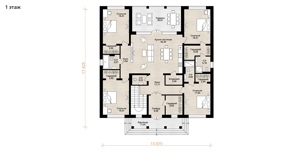 Стены: из керамического блока Porotherm 38 Thermo, Porotherm 25 внутри. Теплый кладочный раствор Porotherm и жб перекрытия: включено.