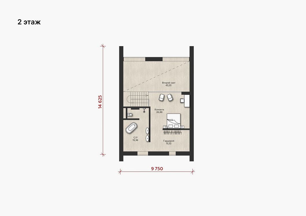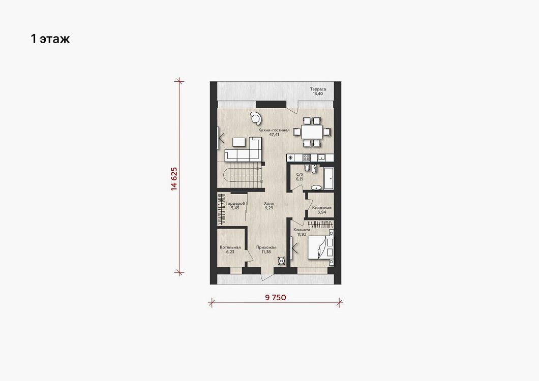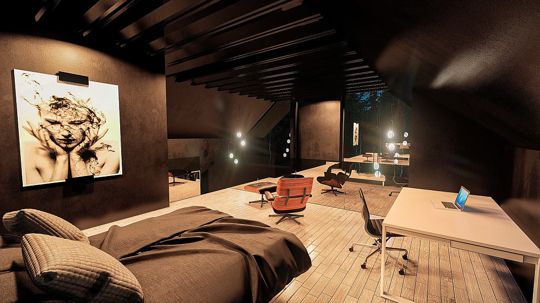 Простые геометрические формы, панорамные окна и объединенное пространство делают его легким и воздушным. Для облицовки использован темный клееный брус, который идеально вписывается в природный ландшафт. Первый этаж состоит из просторной гостиной и кухни-столовой, а также открытой террасы. Второй этаж - личный остров комфорта, где вы найдете просторную спальню, ванную комнату с джакузи и гардероб.