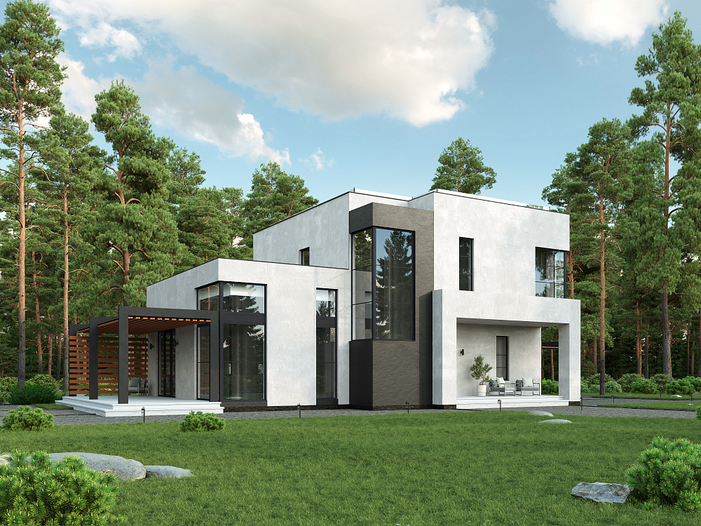 Двухэтажный дом в стиле хайтек объединяет в себе функциональность, инновации и простоту формы.
