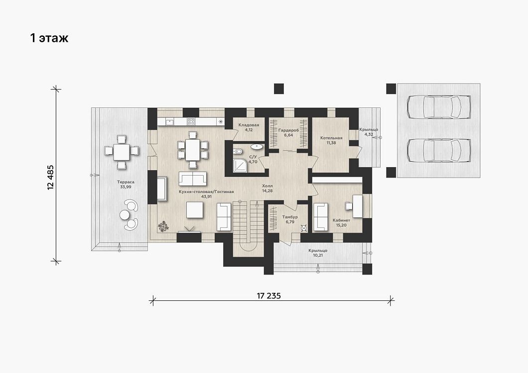 Объединенное пространство кухни-гостинной с выходом на террасу делает зону совместного отдыха комфортной. Изолированные технические помещения обеспечивают легкий доступ к личным вещам. На первом этаже расположен просторный кабинет для работы.