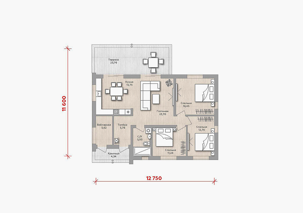 Каждый член семьи найдет в этом доме достаточно пространства для комфортного проживания и отдыха. Окна от пола до потолка обеспечивают естественное освещение и создают уютную атмосферу. Гибкую планировку легко изменить в соответствии с потребностями семьи, а открытая терраса создаст отличные условия для отдыха.