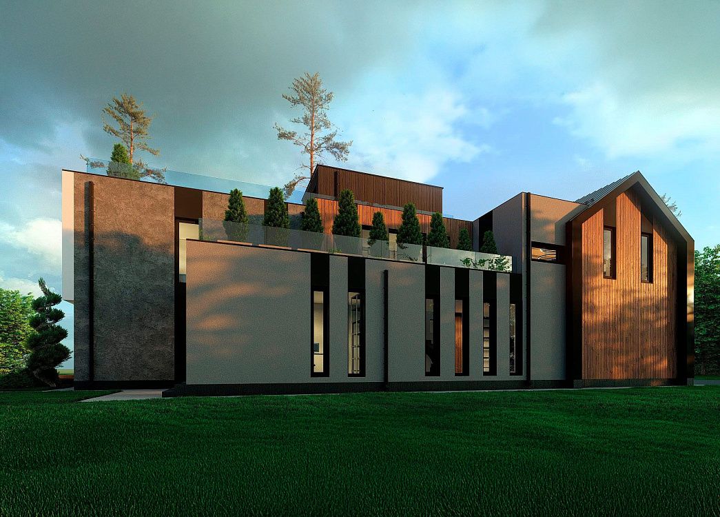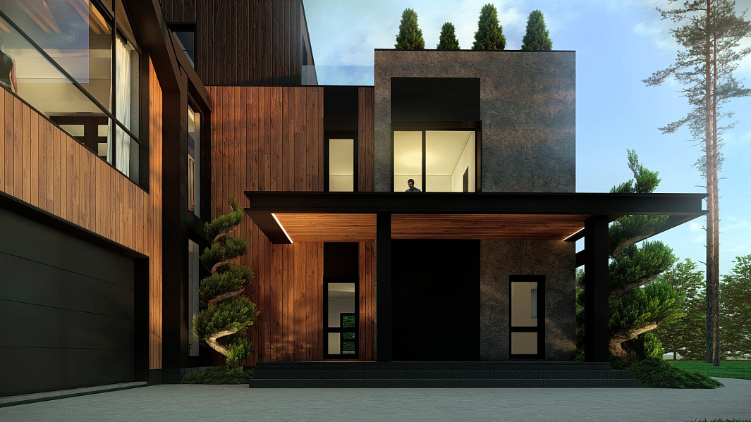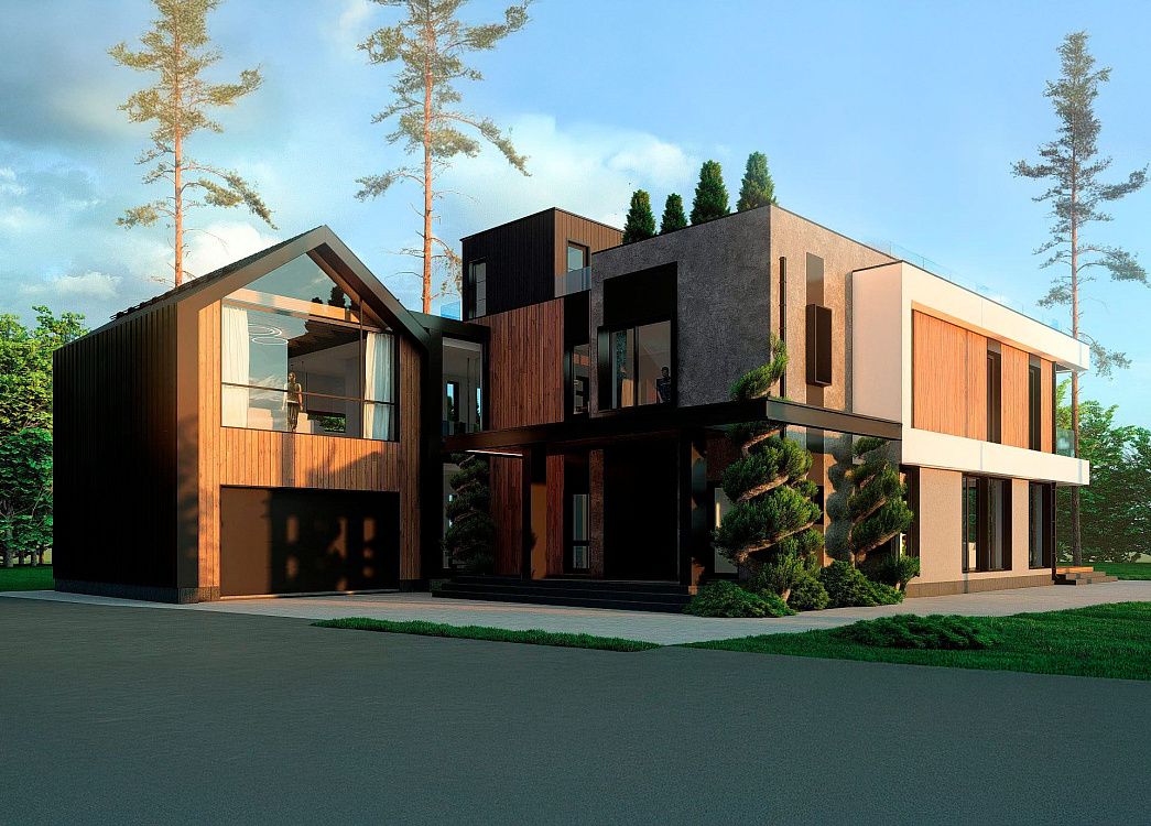Оригинальное сочетание фактур и геометрических форм воплощают современное видение загородной архитектуры.
