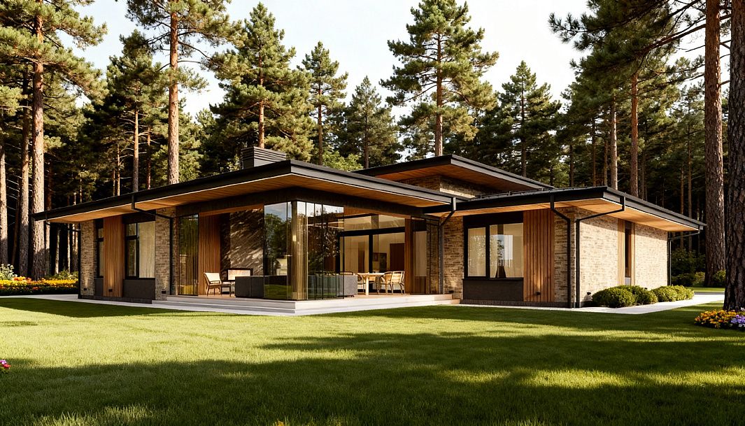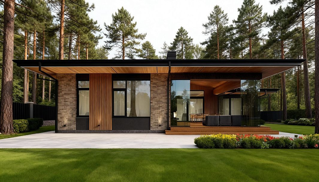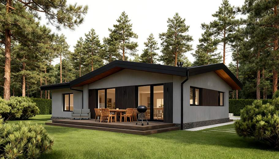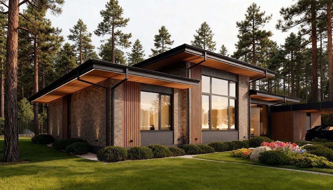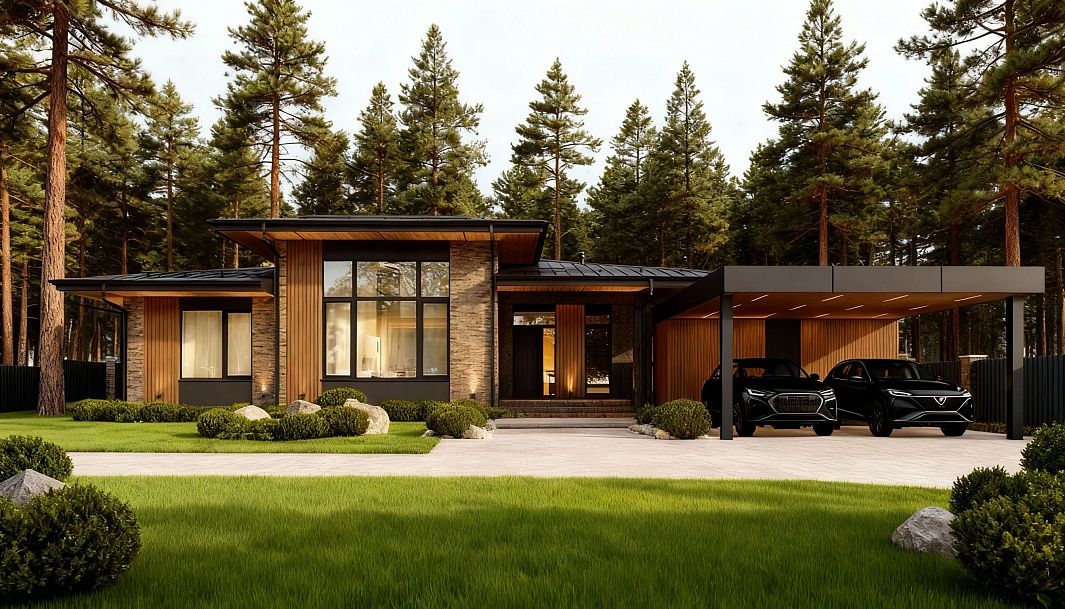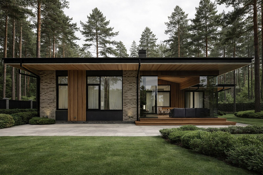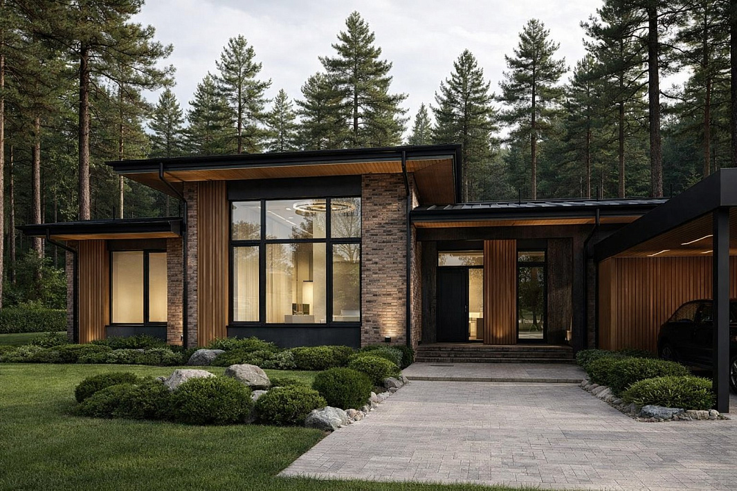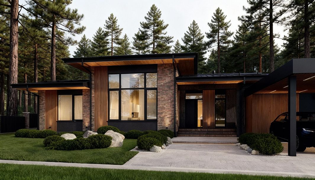 Стильный и современный дом Silva предлагает идеальное сочетание эстетики и функциональности для комфортной и роскошной загородной жизни. Фасад с эффектными свесами, выполненный из камня и дерева, создает приятную атмосферу и придает дому особый характер.