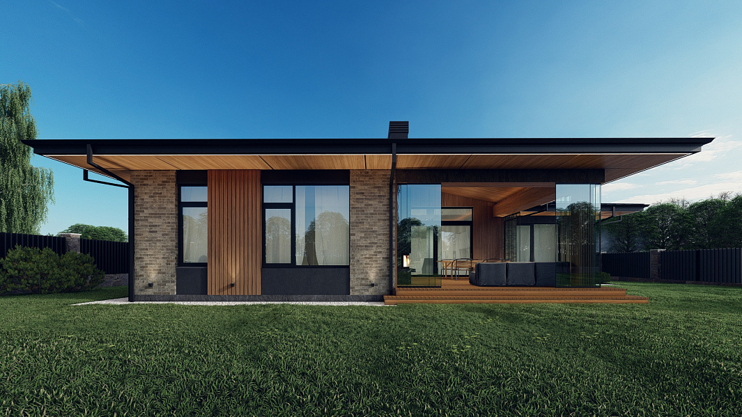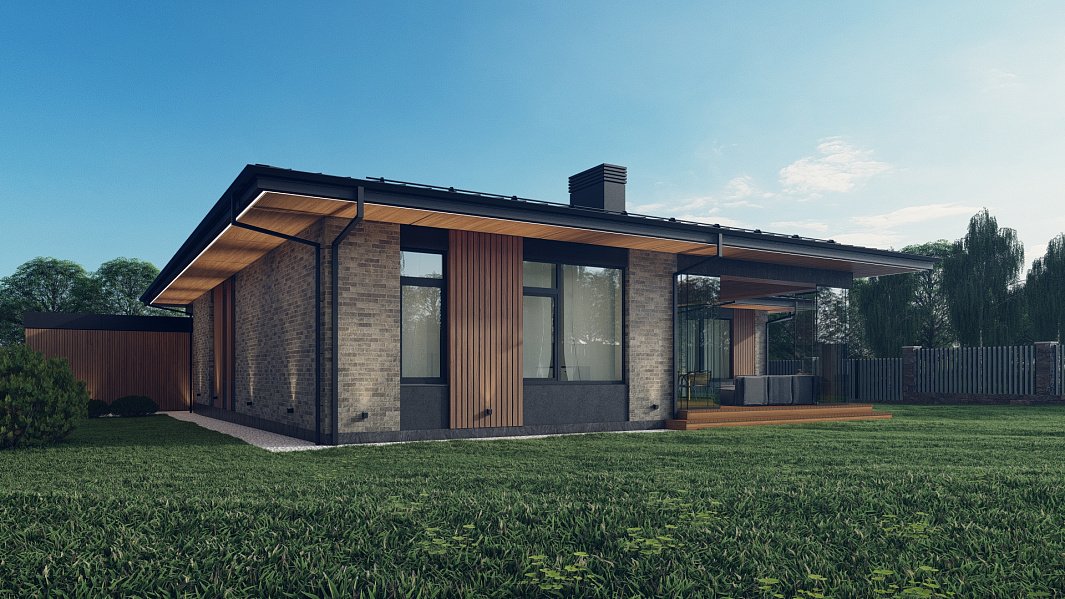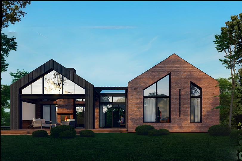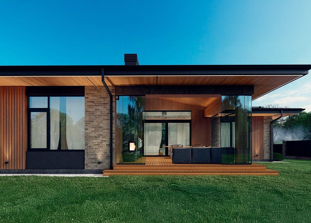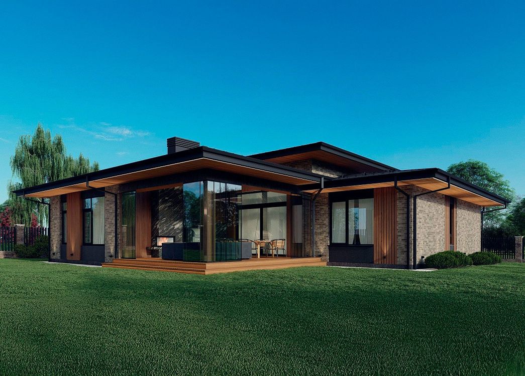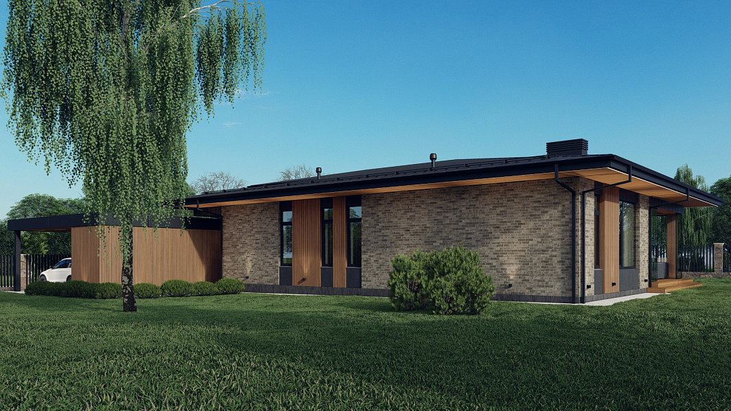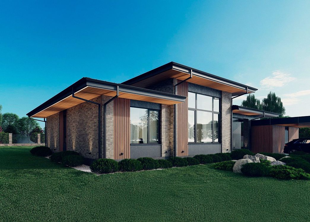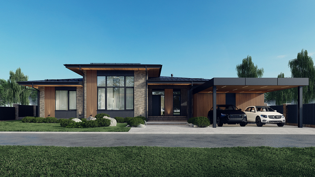 Стильный и современный дом П375 предлагает идеальное сочетание эстетики и функциональности для комфортной и роскошной загородной жизни. Фасад с эффектными свесами, выполненный из камня и дерева, создает приятную атмосферу и придает дому особый характер.