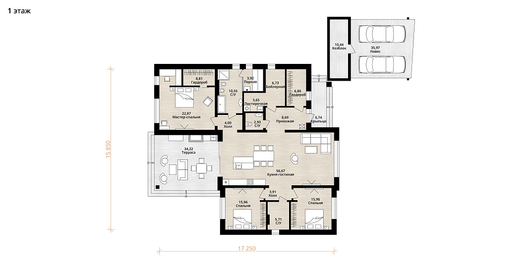За гостиной расположены две спальни по 15 м², что обеспечивает комфортное проживание. В другой части дома находится большая и удобная мастер-спальня — место отдыха и уединения. Рядом с ней размещен санузел с уютной парной для расслабления и оздоровления.