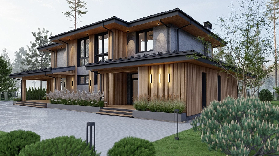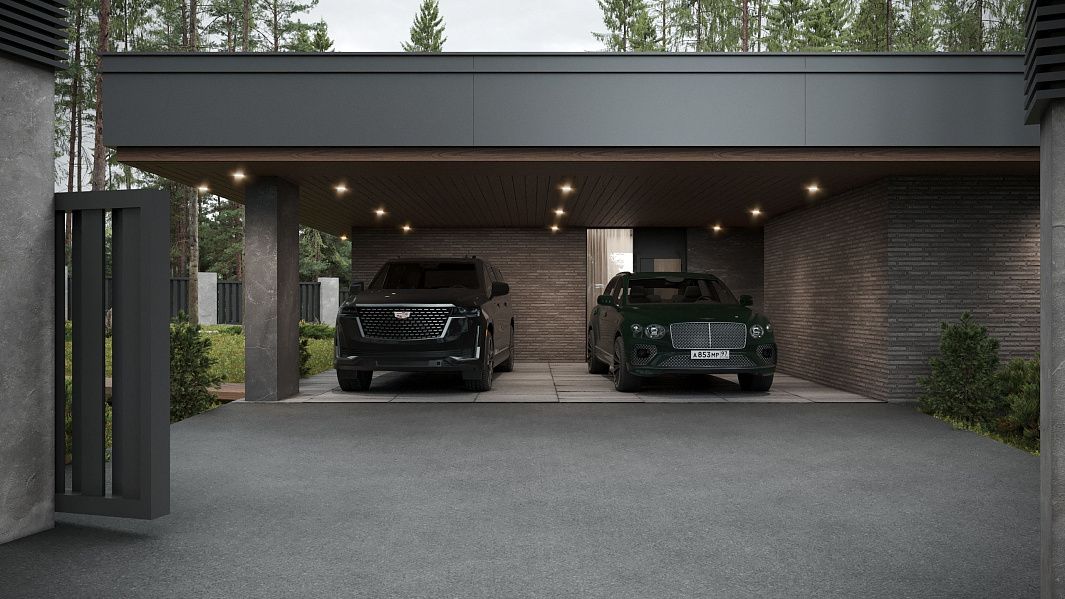 Дом, котельная и навес для автомобилей объединены общей кровлей, формируя цельную архитектурную композицию, где каждая деталь продумана для удобства и эстетики.