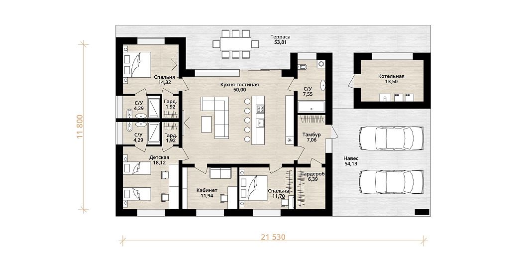 Внутреннее зонирование дома создает гармоничный баланс между уединением и комфортным общением. Центральной частью дома является просторная и светлая гостиная с кухней-столовой (50 м²) и выходом на террасу, что визуально расширяет пространство и усиливает связь с природой.