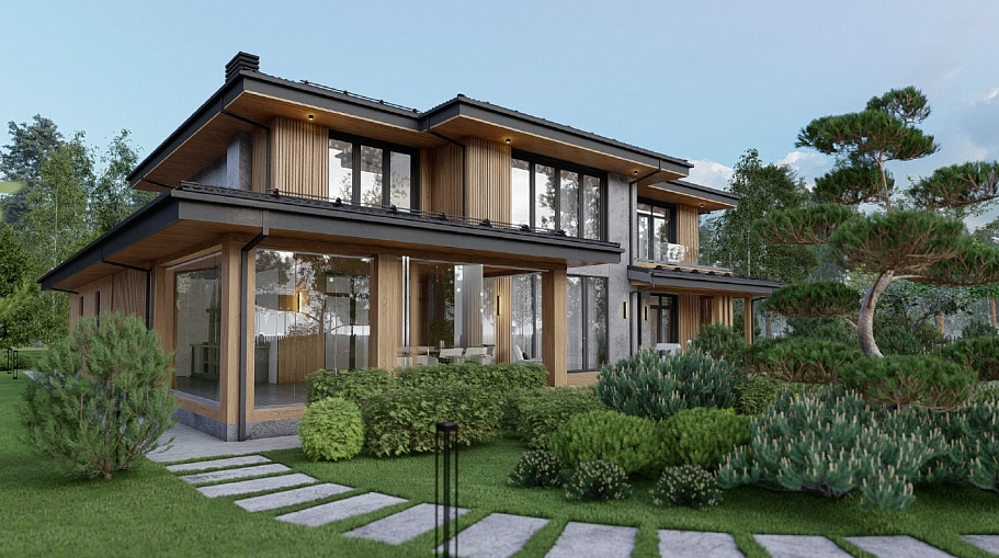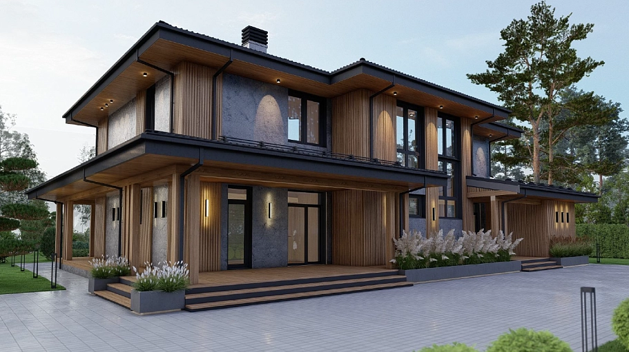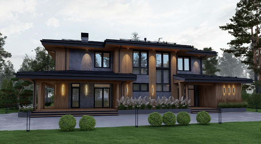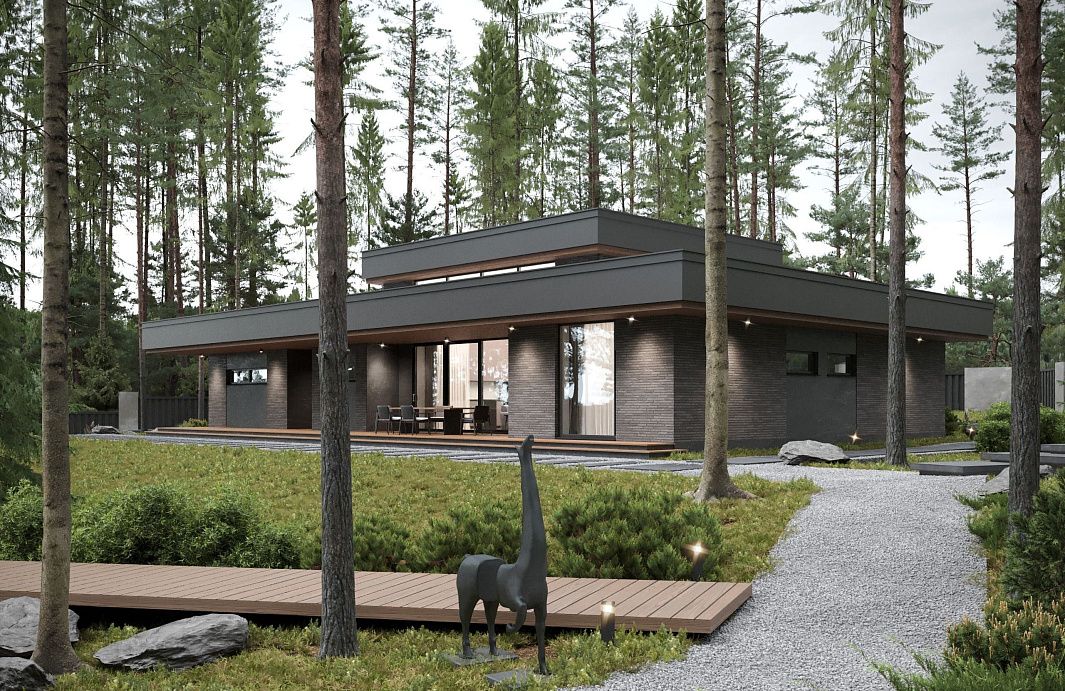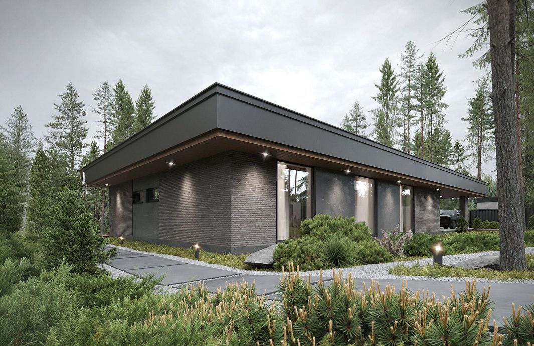 Четкие геометрические формы, плоская крыша с выразительным центральным объемом и панорамные окна создают ощущение легкости и открытости. Темные оттенки облицовочного кирпича и древесины придают фасаду строгую элегантность. Встроенные светильники подчеркивают линии здания и ландшафта, создавая эффектную подсветку в вечернее время.