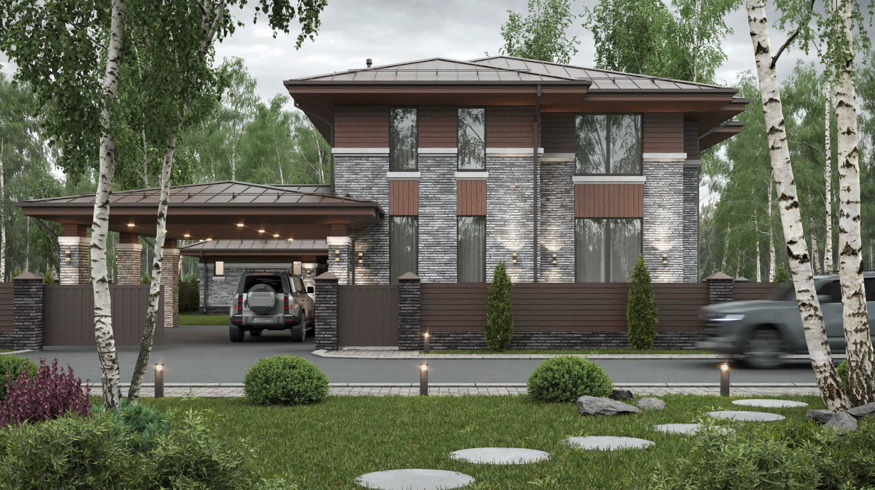 Классическая вальмовая крыша глубокого коричневого цвета гармонично сочетается с деревянными элементами фасада. Широкие карнизы защищают дом от осадков и придают архитектуре массивность и основательность. Просторное крыльцо с широкой лестницей формирует парадный вход, подчеркивая статусность дома. Интегрированный в архитектурную композицию, навес для автомобилей дополняет общий ансамбль.