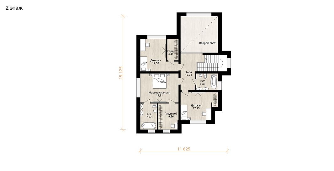 Второй этаж — приватная зона для семьи. Второй свет наполняет пространство воздухом и визуально расширяет его. Мастер-спальня обеспечивает комфорт владельцам. Две детские комнаты создают просторное и уютное личное пространство. Для общего удобства предусмотрен отдельный санузел.