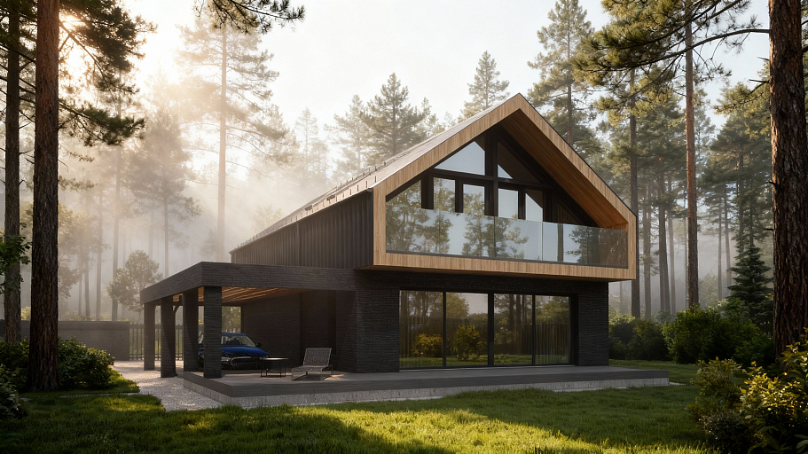 Фасад выполнен из натуральных материалов: облицовочный кирпич в серо-графитовой гамме сочетается с деревянными панелями теплого орехового оттенка, создавая выразительный контраст. Белые горизонтальные линии подчеркивают геометрию здания, добавляя композиции легкость и динамику.