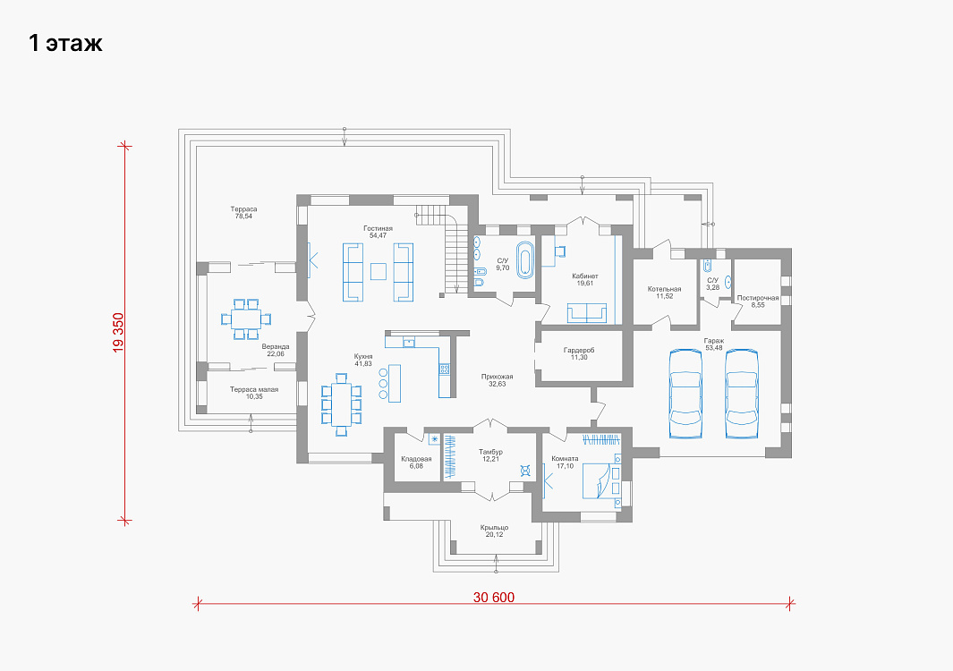 На первом этаже находится гараж на две машины, постирочная и котельная. Также здесь есть кабинет с выходом на террасу, где вы сможете спокойно работать или уединиться.