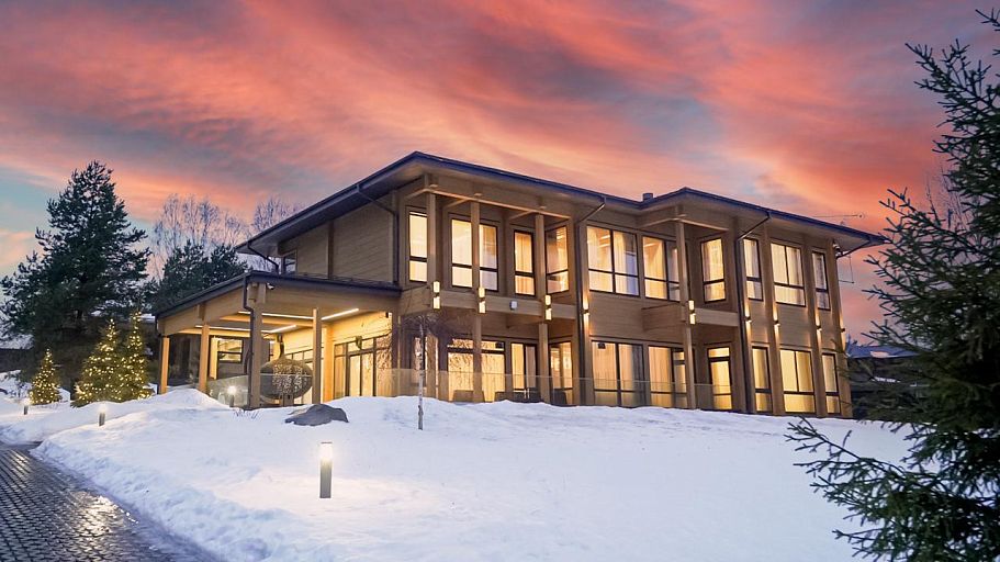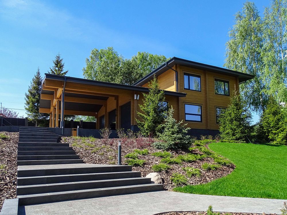 Отдельного внимания заслуживает гостевой домик, объединенный с гаражом, а также работа по ландшафтному дизайну