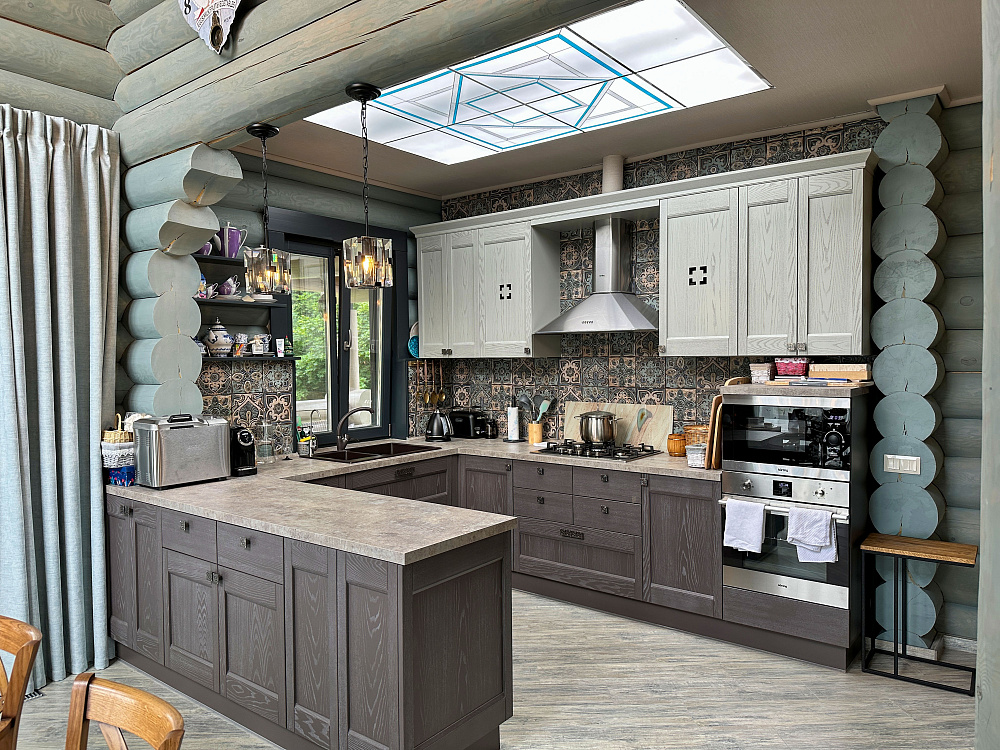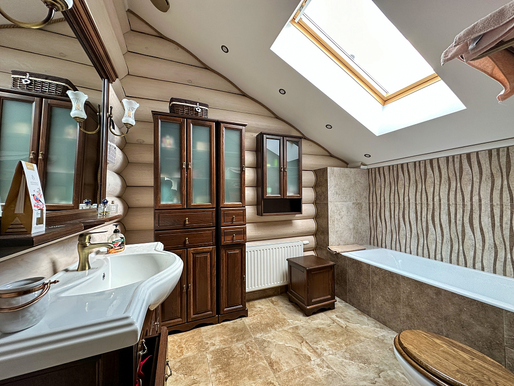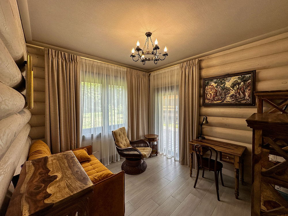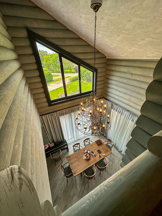 Резные перила и фактура дерева передают колорит загородной жизни. Пространство первого этажа - зона совместного отдыха и общения с близкими. Отдельная гостевая позволяет комфортно проводить встречи с друзьями. Продолжить общение наслаждаясь природой и свежим воздухом можно на одной из двух просторных террас.