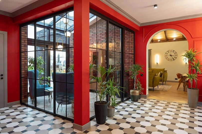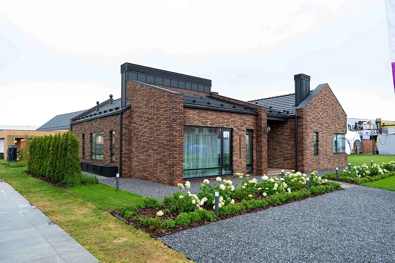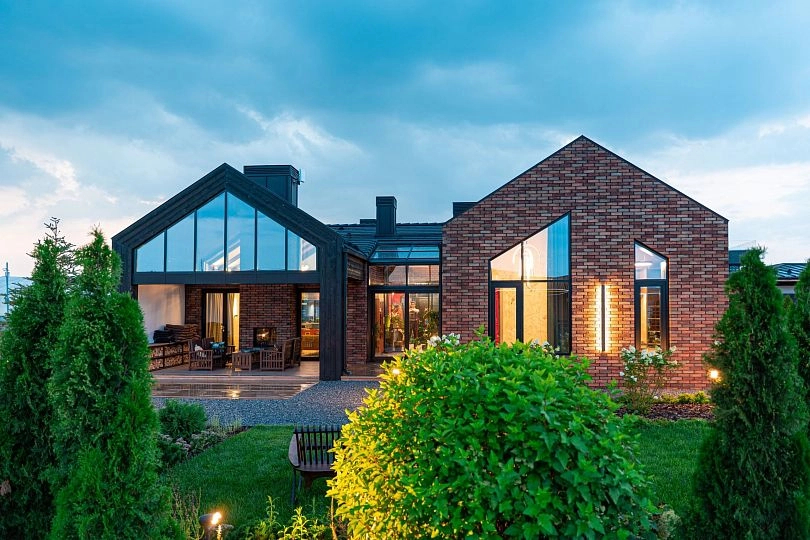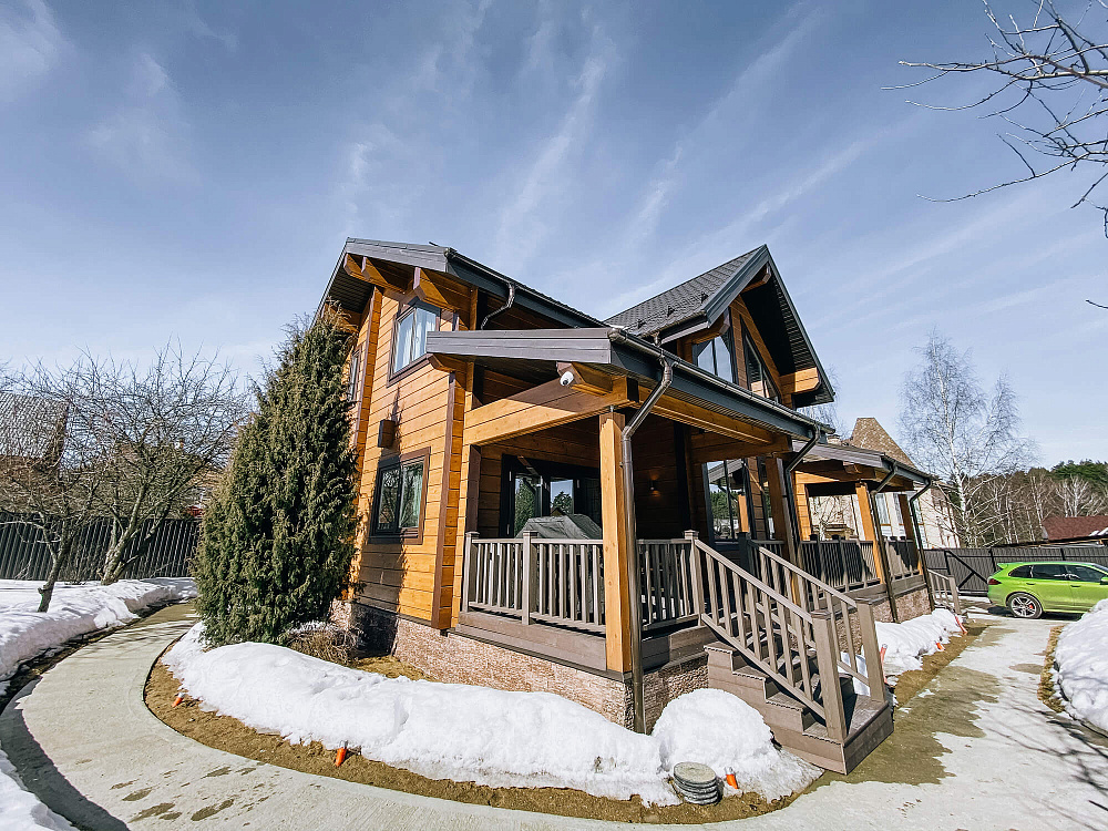 Стильный дом из клееного бруса с верандой и большими окнами, которые обеспечивают отличное естественное освещение.