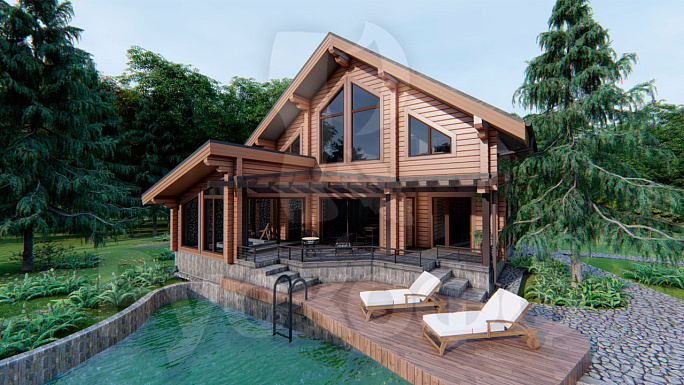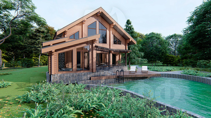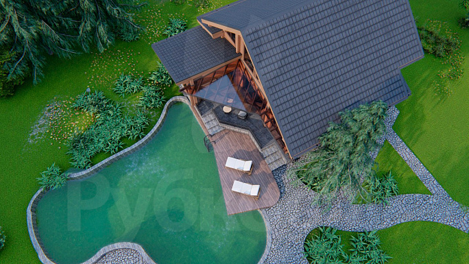 На визуализации видна главная особенность проекта - джакузи с панорамным остеклением и выходом на террасу, к которой также примыкает просторная комната отдыха. А еще с задней стороны дома предусмотрен дровник. В нем дрова будут сухие в любую погоду.