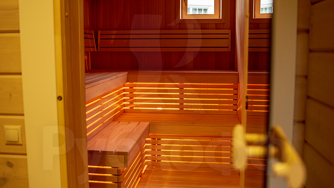 Главная особенность этого проекта - большой бассейн. Клееный брус отлично ведет себя в условиях высокой влажности. Поэтому в качестве материала для бани выбрали именно его.