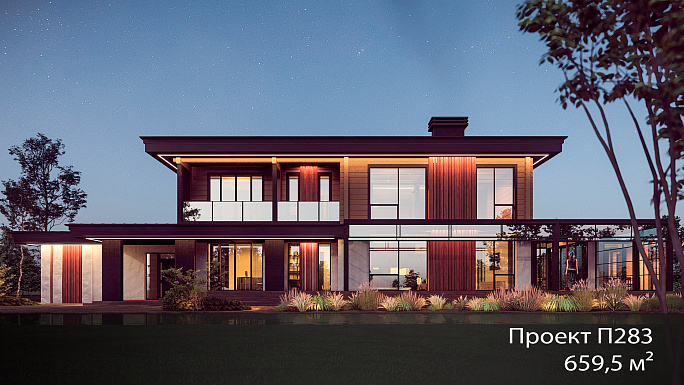П283, 659,5 м2. Дом в современном стиле, в комбинированном исполнении для большой семьи, с большим количеством панорамного остекления и крытыми террасами. Идеальный вариант для любителей проводить время на открытом воздухе. Особенностью этого дома является сочетание каменной и деревянной архитектуры. Некий компромис позволяющий взять всё лучшее, что есть в разных технологиях. Первый этаж в каменном исполнении придаёт монументальный и устойчивый вид, а деревянная жилая часть позволяет погрузится в атмосферу загородного дома. https://rubkoff.ru/catalog/proekt-doma-p283/?type=kamennyj