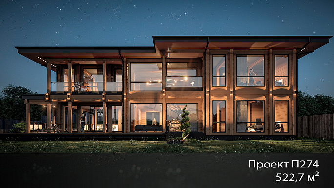 П274, 522,7 м2. Деревянная вилла в современном стиле с панорамными окнами позволяющими впустить в себя природу. Яркой отличительной особенностью этого проекта является парадная винтовая лестница и гостиная со вторым светом и галереями на 2 этаже. Утонченный и гармоничный образ дома отсылает нас к образу итальянских вилл. https://rubkoff.ru/catalog/proekt-doma-p274/?type=kleenyy-brus