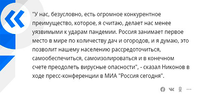 Уважаемый человек, председатель комитета Госдумы по образованию и науке Вячеслав Никонов считает, что наличие дач и загородных участков в условиях пандемии делает нас менее уязвимыми к ее распространению. (цитата на фото)